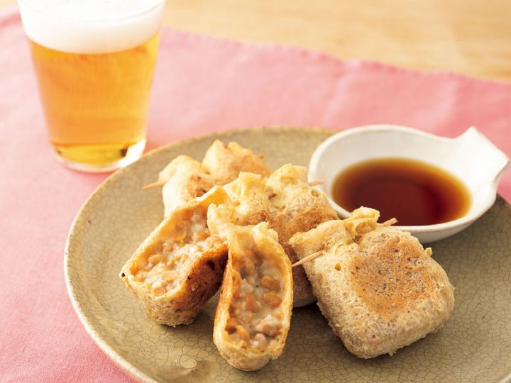 「納豆信田」は、油揚げで野菜や豆腐、魚のすり身などを巻く〈信田巻き〉の具を納豆にしたユニークな一品。袋状に開いた油揚げを裏返して焼けば、外はカリッと、中はふわふわ。つけつゆは市販のめんつゆでもOKです!