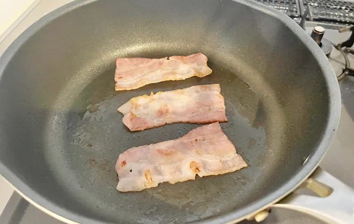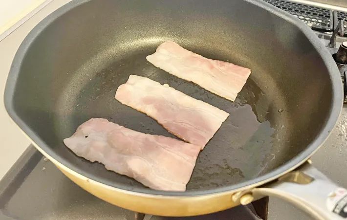 熱したフライパンにサラダ油を引き、ベーコンを入れて焼きます。