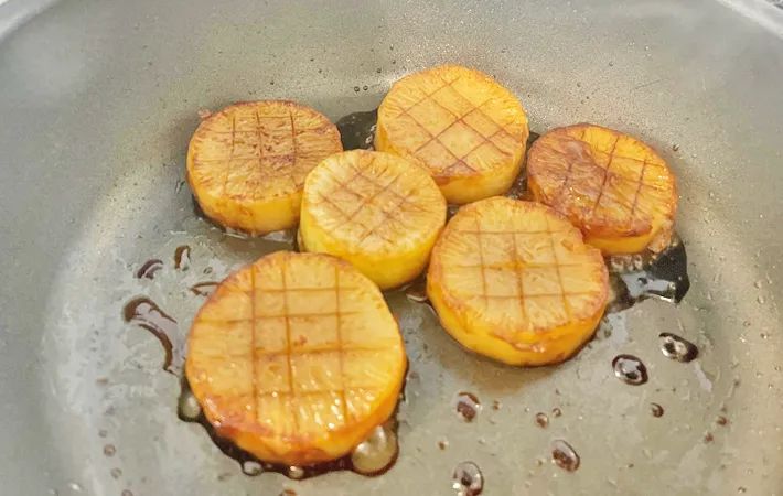 次に、熱したフライパンにサラダ油を引き、電子レンジから取り出しておいた大根を並べます。