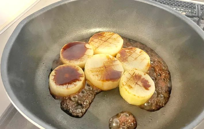 両面に焼き色がついたら、先ほど混ぜ合わせたタレを大根にかけるようにして入れましょう。