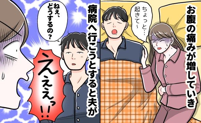 夜中、腹痛で起きた私は段々と増す痛みに立てなくなり、横で寝ている夫を必死に呼びました。陣痛を思い出すような強烈な痛みで我慢できなくなってきたため、「病院へ行きたい」と夫に伝えたところ……。