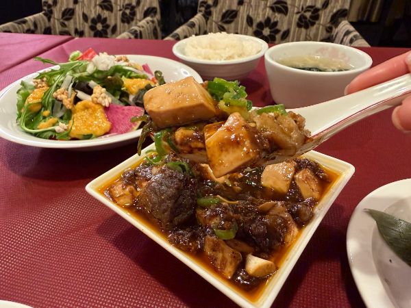 麻婆豆腐は一番人気で、四川とつくから辛さしっかりかと思ったらやさしい味わいでした。そして、驚いたことにお肉がごろっごろ入っています。