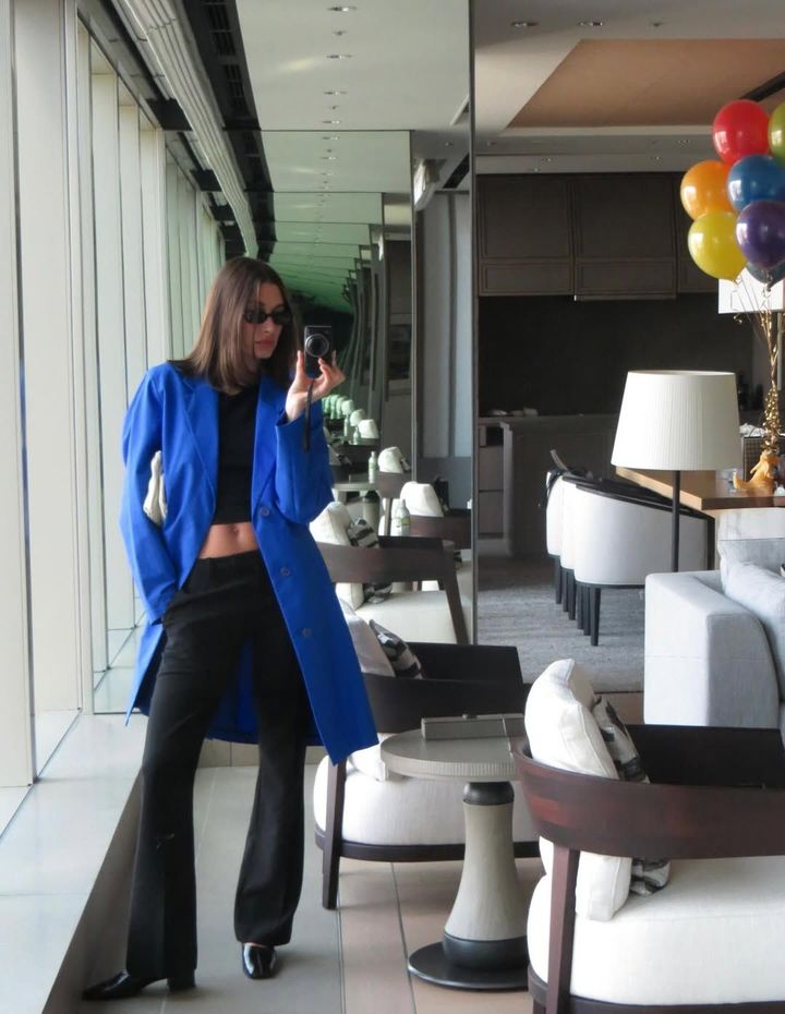 東京を見渡すホテルのスイートルームから、ヘイリーは自身のシグネチャースタイルや新たに手に入れたアイテム、そしてトレンドピースを取り入れたコーディネートを多数投稿。まず登場したのは、2011年春夏コレクションのヴィンテージのジル サンダーJIL SANDER)のコート。トレンドカラーでもあるコバルトブルーが印象的な一着で、ハイネックのブラックのクロップトップにフィット&フレアのブラックパンツを合わせ、白のハンドバッグ、さらにリフォーメーションREFORMATION)のブロックヒール「Inez」パンプスで仕上げていた。