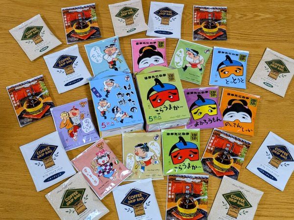 ドリップバッグ用の包装袋がたくさん並んでいます。長崎のテーマパークの物もありました!