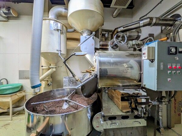工場内はコーヒーの良い香りが漂っています。焙煎し終わった豆が予熱で焙煎が進まないように、冷却されているところです。コーヒー豆がぐるぐる回りながら冷やされていきます。