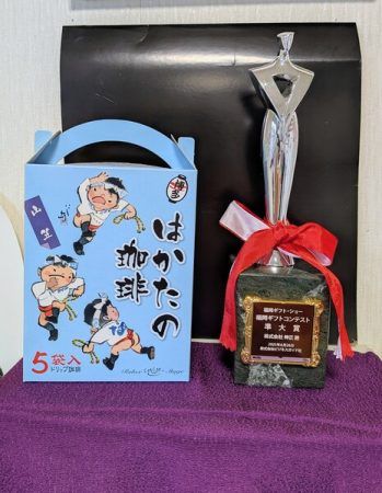 「はかたの珈琲」が昨年の福岡ギフトコンテストで準大賞に輝きました! ※福岡ギフトコンテストは、2005年から行われている(昨年はマリンメッセ福岡で開催)見本市「福岡ギフト・ショー」(株式会社ビジネスガイド社主催)に出展された食品、雑貨、特産品などの中から投票で決まります。