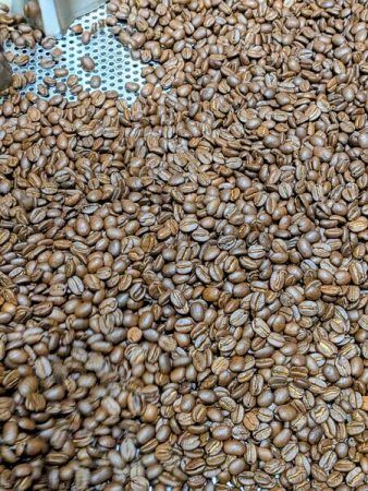一度に30kgが焙煎できるそうです。焙煎後はつやつやですね。香りがいいのでずっとこの場所にいたくなります。回る豆が珍しく、しばらく動けませんでした。