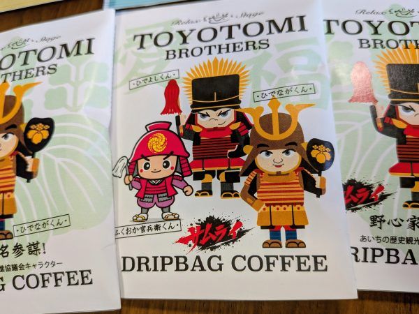 今年の大河ドラマにちなんで作られたデザイン。ふくおか官兵衛くんと、あいちの歴史観光協議会キャラクターのひでよしくんとひでながくんが並んでいます。今月発売です。
