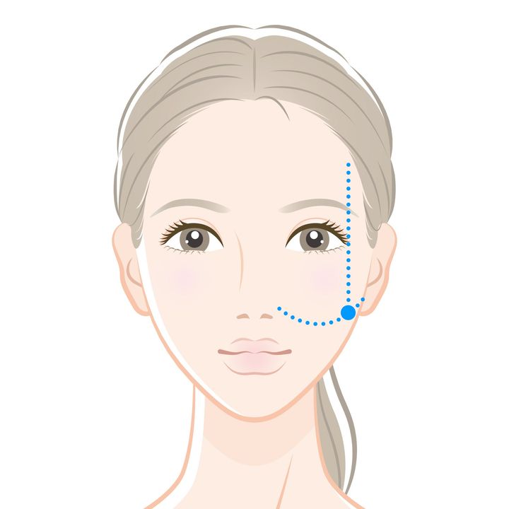 • 目尻から垂直に下がり、頬骨下のへこみと交差する位置。