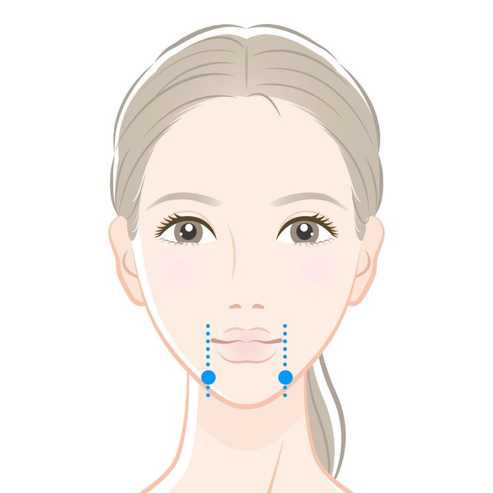 • 口角より垂直に下がった延長線と、下あごの骨沿いのへこみが交差する位置。