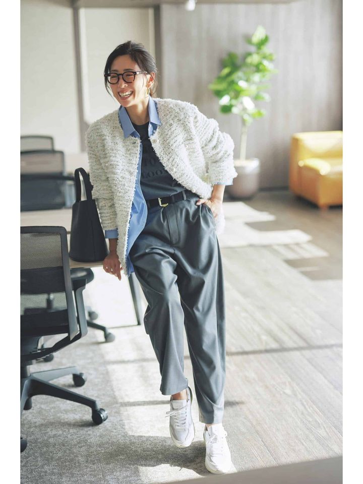 ツイードジャケット¥82,500(デパリエ/デパリエ 伊勢丹新宿店)ペプラムトップス¥23,100(ツル バイ マリコ オイカワ)パンツ¥12,000(PLST)バッグ¥42,900(ジャンニ キアリーニ/ジャンニ キアリーニ銀座店)メッシュパンプス¥13,200(ル タロン/ル タロン 有楽町マルイ店)ネックレス¥63,800(カミーユスロ/オブリオ)バングル¥7,830(アビステ)
