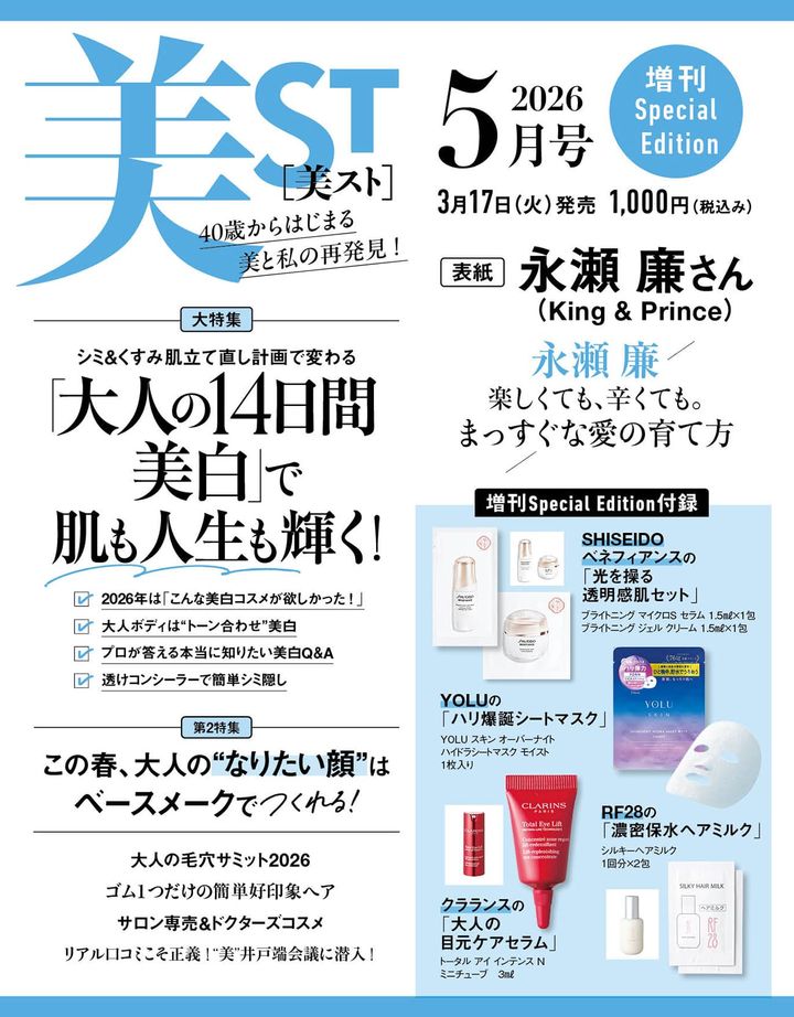 3月17日(火)発売の美ST2026年5月号は神崎恵さん&永瀬廉さん(King&Prince)が目印です!