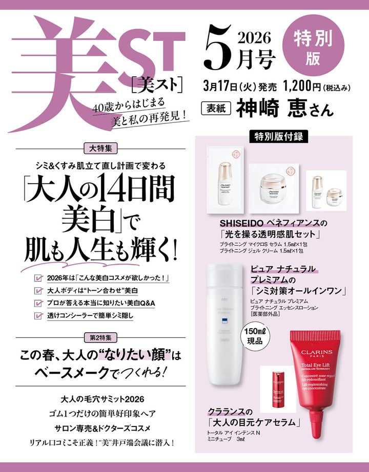3月17日(火)発売・美ST2026年5月号のネット書店予約がスタートしました!神崎恵さん&永瀬廉さん(King&Prince)が表紙を飾ります。お二人とも美ST初表紙です!共通付録はSHISEIDO ベネフィアンスの透明感肌セット。さらに本誌にはKAHIのUVが50g現品サイズ、特別版にはピュア ナチュラル プレミアムのオールインワンがなんと現品付録に。一部ネット予約限定の特別版増刊にはmegood beautyのシートマスクとかっさ現品がつきます。その他多数の付録がつく豪華仕様です。ネット書店が完売の際は、お近くの書店でのご予約がおすすめです。