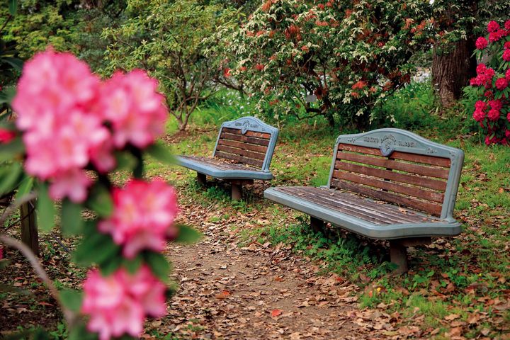 シャクナゲ園内にはいくつものゆったりしたベンチがあり、座ってのんびりスケッチをするのもいい。シャクナゲが咲き始める時季は、チューリップや桜も併せて観賞できる。