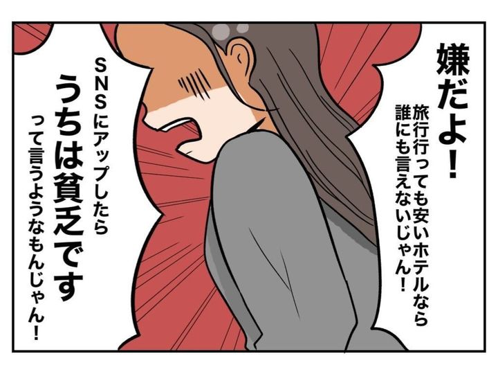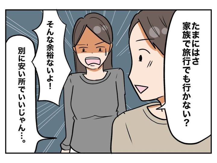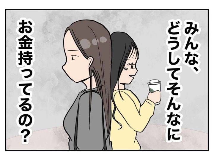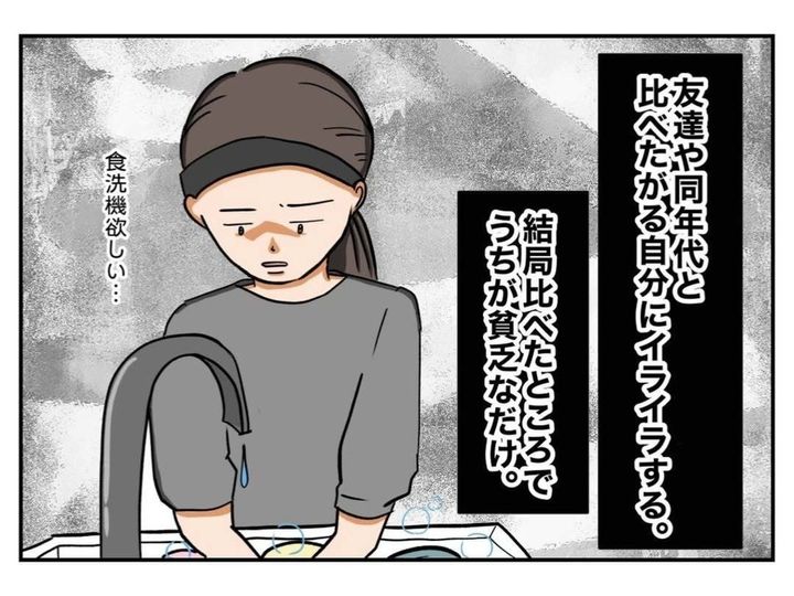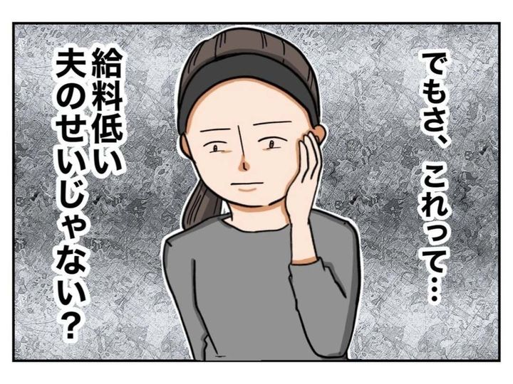 周囲の友人たちと、自分の生活を比べ、ますます卑屈になってしまったメイカ。頭では「比べたところで」と、わかっていても、気にせずにはいられません。そして、イライラの原因は「夫の低収入のせい」という結論に至ってしまいます。