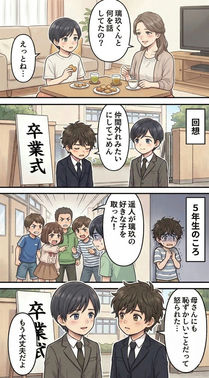 卒業式の日。とうとう璃玖君と学校に来るのは最後。母としては、幼なじみ同士一緒に写真を撮りたい気持ちなのですが、別のクラスなので彩さんとも話すタイミングがありません。遥人はあれから翔くんや拓海くんという大切な友達ができたのですが、やはり幼なじみの璃玖くんは特別に感じられていました。