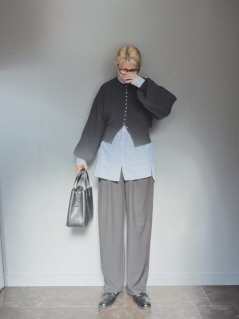 カーディガンの中に着る服といえば定番なのが襟付きシャツ。ショート丈カーディガンの場合はシャツをウエストインせず、裾出しするのがコツです。これならウエストまわりがモタつかず、スマートなルックスに。カーディガンがコンパクトなので、長めのシャツでもスッキリとして見えますよ。