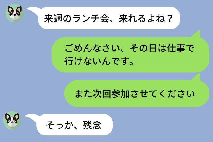 ある日、彼女からLINEが届きました。「来週のランチ会、来れるよね?」。でも、その日は外せない仕事が入っていました。
