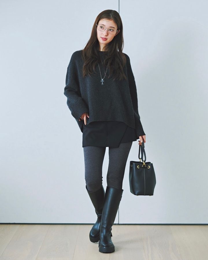 3月10日(火)、シンプルなワントーンコーデだからこそ、質にこだわったアイテム選びを。ゆるシルエットのカシミアニットが、こなれた抜け感を演出してくれます。ミニ丈にレギンスを合わせた今っぽいレイヤードで、黒トーンの脚長ラインを強調して。色数を抑えた分、素材の良さで魅せる大人のシンプルスタイルです。