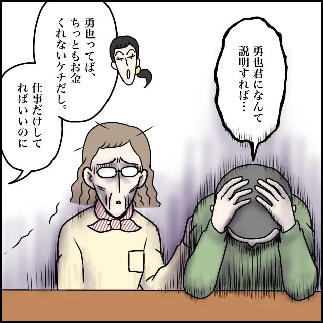 義父は「勇也君になんて説明すれば・・」と頭を抱えてうなだれ、義母は信じられないと言った様子で呆然とテーブルを見つめています。義父も義母も、この数分ですっかり老け込んでしまったように見えます。それでも玲美さんは悪びれず「勇也ってば、ちっともお金くれないしケチだし。仕事だけしてればいいのに」と勇也さんへの不満を口にします。