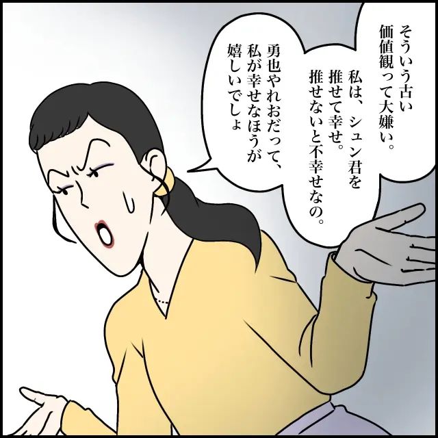 しかし、玲美さんは「そういう古い価値観って大嫌い。私は、シュン君を推せて幸せ。推せないと不幸せなの。勇也やれおだって、私が幸せなほうが嬉しいでしょ」と自分に都合の良い主張をします。