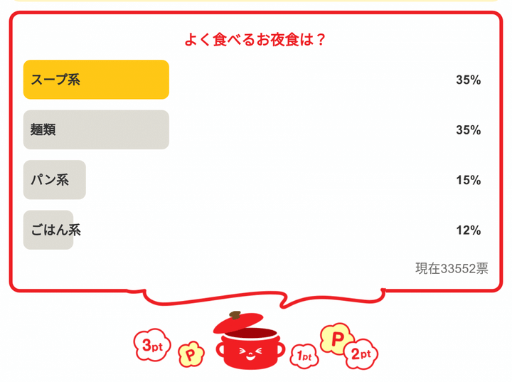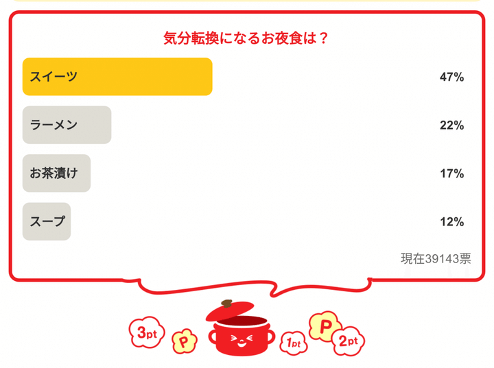 忙しい日やがんばった日の夜に、無理のない範囲で楽しむお夜食。みなさんはどんな一品を選びますか?それでは、次回のアンケートもどうぞお楽しみに!