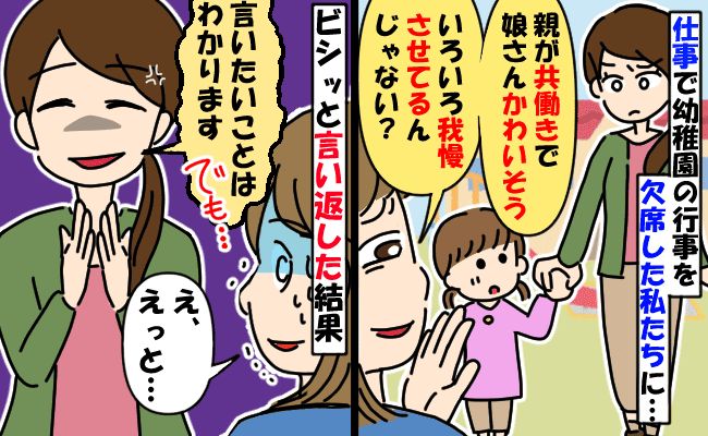 3. 仕事で幼稚園行事を欠席。ママ友が「我慢させてかわいそう」嫌みを言われモヤッ…ビシッと反論した結果