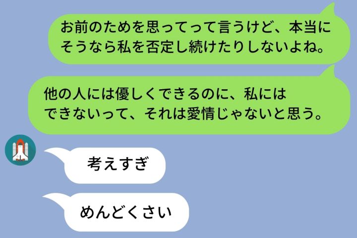 帰宅後、彼にLINEを送りました。「お前のためを思ってって言うけど、本当にそうなら私を否定し続けたりしないよね。他の人には優しくできるのに、私にはできないって、それは愛情じゃないと思う」。 彼からは「考えすぎ」「めんどくさい」と返ってきました。その言葉を見て、決心がつきました。「別れよう」と送って、私はブロックしました。 それから少しずつ、好きな服を着るようになりました。会いたい友人に会うようになりました。否定されない毎日が、こんなに楽だったなんて。「お前のため」は、全部「彼のため」だったのです。自分を取り戻せて、本当によかった。