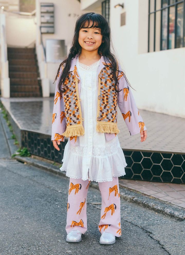 ヴィンテージのレースワンピースをレイヤードして取り入れた、親子コーデがセンス抜群! ブラックでモードにまとめたママに、柄やモチーフでポップに決めたキッズと、それぞれの世界観で春スタイルを表現。ライトブルーのシューズやクロシェベストなど、こだわりの挿し色使いにも注目。