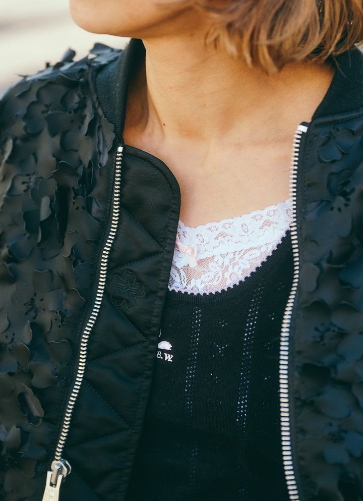 トレンドのレースアイテムも、レイヤード技でバランスよく仕上がる。重くなりがちなブラックコーデは、ほどよい肌見せで軽やかに仕上げるのがサマ見えのコツ。