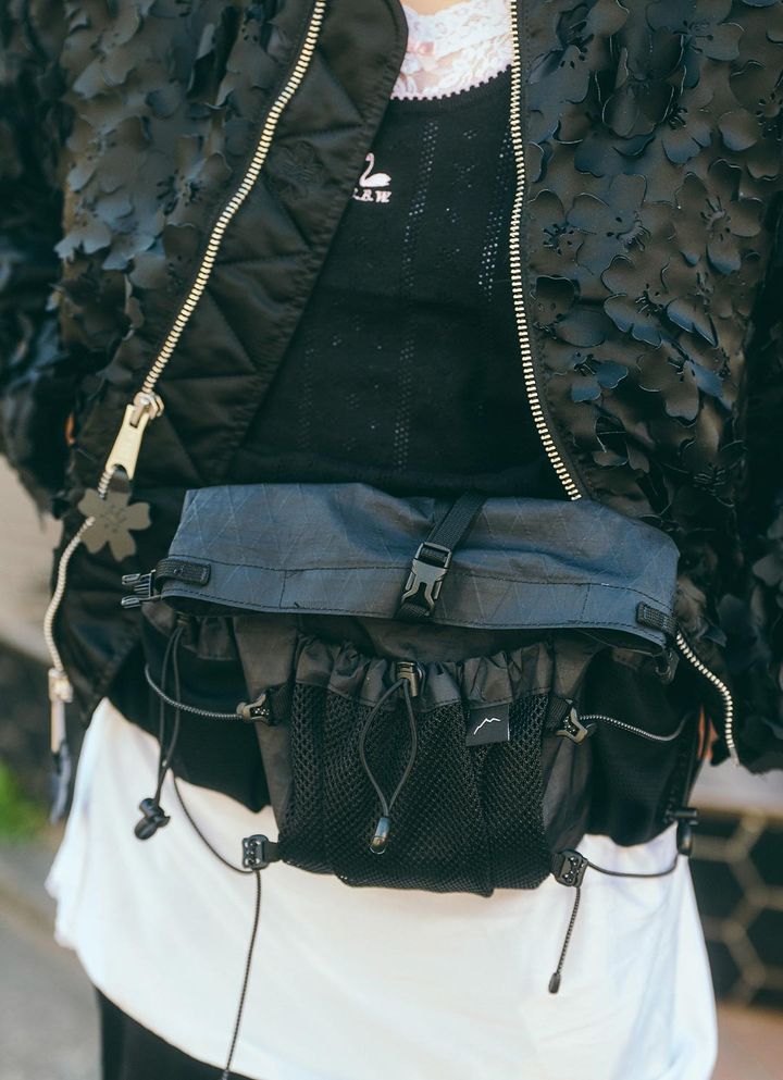 スポーティなウエストバッグは、動きのあるドローイングコードがポイント。主役のアウターと同じブラックで世界観はそのままに、エッジを効かせて♪