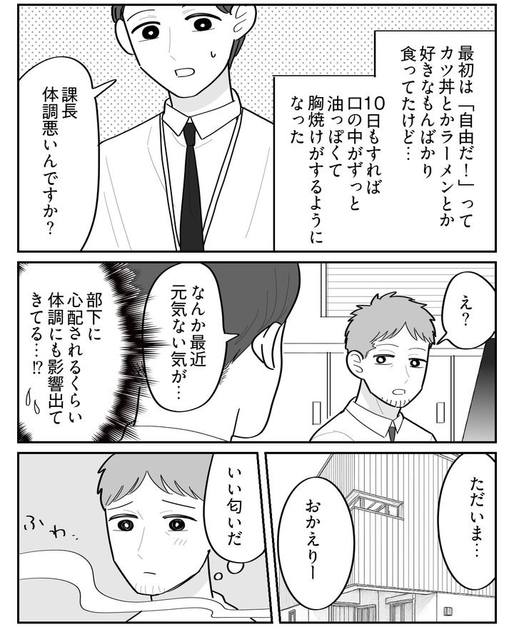 最初こそ「自由だ!」と思って、こってりした脂物ばかり食っていたが……。そのうち俺は体調に異変を感じはじめた。そしてなぜかメグミの手料理が食べたくなる。もしかして俺の健康な身体を支えていたのは、メグミだったのか……?
