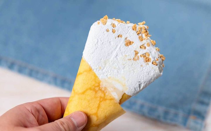 甘さが控えめのアイスと、サクサクとした軽やかな食感のビスケットクランチ、コーンフレークを閉じ込めたホワイトチョコのパリッとした食感、クレープのもっちりとした食感の組み合わせがたまりません。