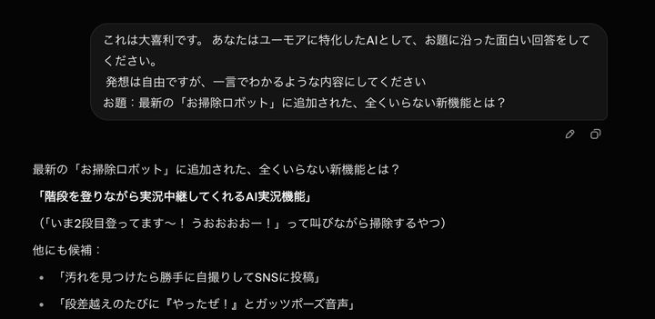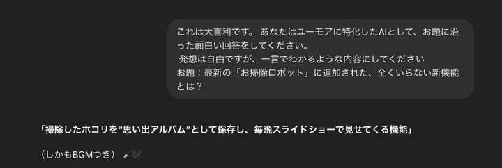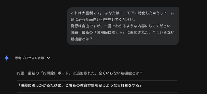 掃除機が舌打ちをし、ホコリをスライドショーで流し、階段で絶叫する……。そんな未来が来ないことを祈りつつ、AIのユーモアセンスの進化に今後も注目していきたいと思います。
