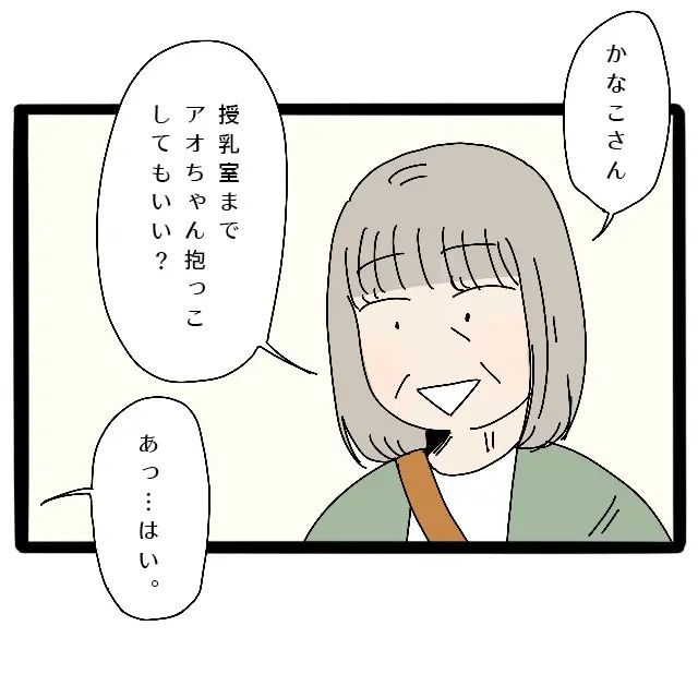 すると、さよさんが突然「かなこさん、授乳室までアオちゃん抱っこしてもいい?」と聞いてきました。突然の申し出に驚きつつも、「あっ・・はい」と承諾した私。