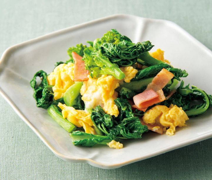 菜の花のほろ苦さとベーコンのうまみがよく合う、旬の一皿。食卓に加えるだけで、いつもの献立もあっという間に春らしくなりますよ。