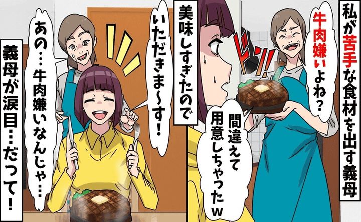 義母「牛肉嫌い?間違えてステーキ用意しちゃった♡」食べ物で嫁いびり。感謝です♡義母が涙目…だって