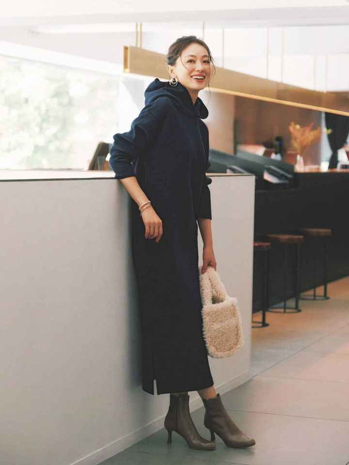 下半身の凹凸を拾わないIラインのワンピは、誰でも細見えが叶う最強アイテム。サイドのスリットからより直線的なシルエットを実現。フードは、顔まわりの寂しさを解消し、抜け感を足してくれます。