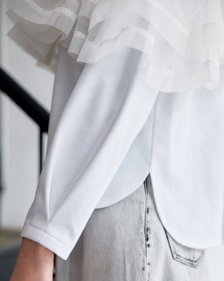 一枚での華やかさは段違い、一気にワンツーコーデのオシャレ指数が上がります。インパクトは与えても着膨れはしないようにチュールで2重のフレアを全体的に施しました。袖にもタックを入れひと工夫し、360度どこから見ても隙のないトップスです。身頃は伸縮性と柔らかな手触りが特徴のジャージー素材なので着心地も抜群。家でのお手入れが可能なのも高ポイントです。