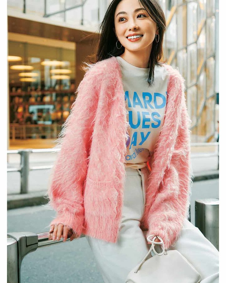 冬コーデがマンネリ化してくる頃、春らしいカラー服で着こなしに更新感を。デニムとも甘いスカートとも相性のいいカーディガン。ウール混で温かく春先は羽織り代わりにもなるので、1枚は持っておくと重宝。ポケットもアクセントに。顔まわりを明るくする心ときめくシャギーの質感が魅力です。