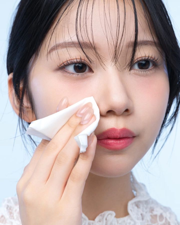 ティッシュを鼻まわりに軽くあてて、浮き出た皮脂やメイクのヨレをやさしくオフ。このときティッシュは肌の上からおさえるだけで、こすらないようにするのがコツ。