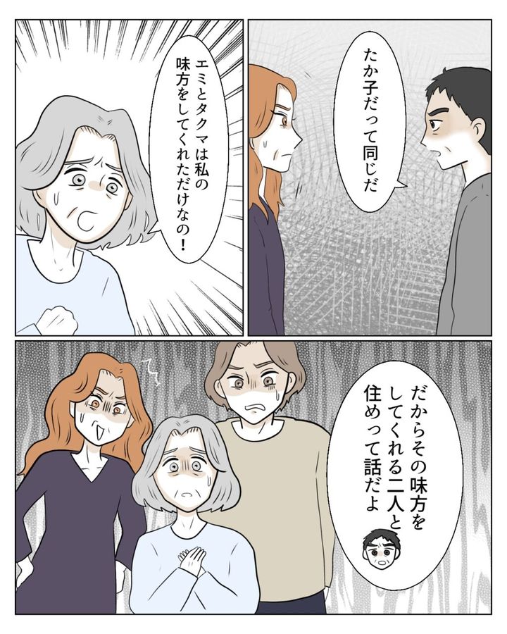「たか子だって同じだ」という和也さんの反論でエミさんが何も言えなくなると、義母は慌てて「エミとタクマは私の味方をしてくれただけなの!」と二人を庇いました。「だからその味方をしてくれる二人と住めって話だよ」と和也さんがもっともなことを言うと、義母、エミさん、タクマくんの三人は言葉に詰まります。