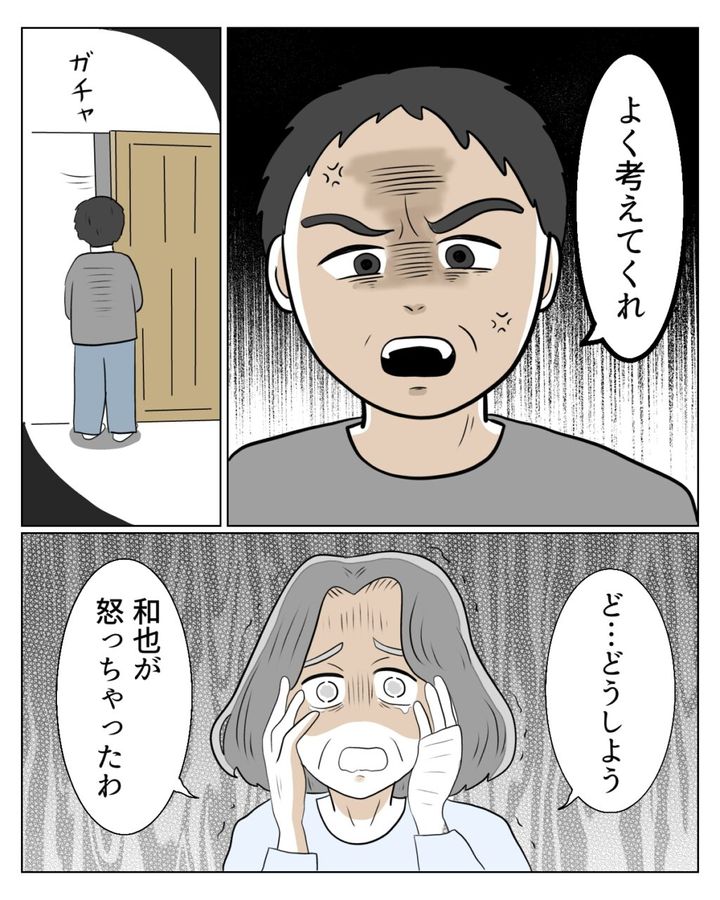 その後、「よく考えてくれ」と言い捨てるように言い、部屋から出て行った和也さんを見て、「ど・・どうしよう。和也が怒っちゃったわ」と義母が動揺しました。