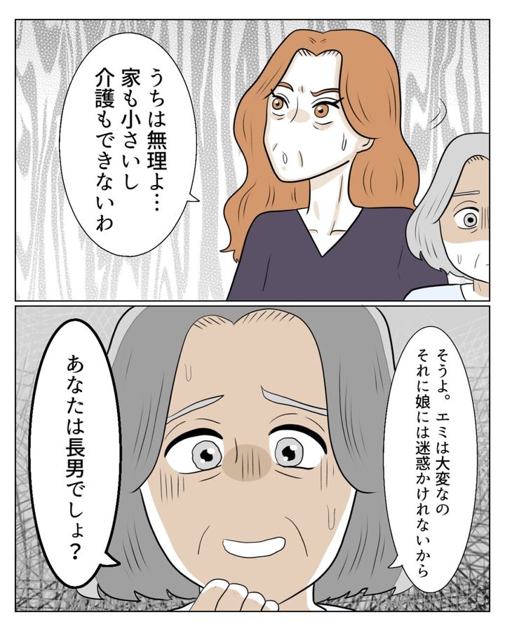 あれだけ義母を心配して私のお世話にケチをつけていたエミさんは、都合が悪くなったようで「うちは無理よ・・。家も小さいし介護もできないわ」と視線を逸らしました。義母は「そうよ。エミは大変なの。それに娘には迷惑かけれないから。あなたは長男でしょ?」とこの期に及んでエミさんを庇い和也さんは長男なのだから親の面倒をみて当たり前という考えのようです。