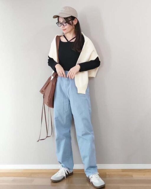 手持ちの「カーディガン」もアウター代わりに活用できます。サッと脱ぎ着しやすく、ちょっと肌寒い日のコーデにもぴったりです。前を閉めて着こなせばクリーンなルックスに。