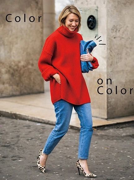 ニットのソフトな素材感は目の覚めるような原色を取り入れるにも好都合。赤いニットが存在感を放つデニムルックに、カラーバッグなどで色を足すのも見違えの一手。一歩まちがうと昔っぽくなる赤ニットは、明るい色を加えるとモダンな見た目に。