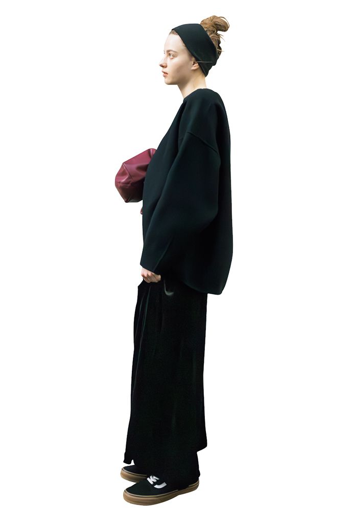ハリのあるウールが、構築的な丸みを形成。対してボトムにはタイトにも見えるベロアワンピをスカートとして採用。形に極端な差がついたことで計算高いバランスへと昇華。赤のバッグでアクセントもひとさじ。