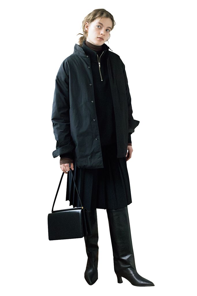 スウェットとシャツライクなダウン、さらに薄手のタートルも加えて隙間なくおおい、冷気をシャットアウト。スカートの短い丈がボリュームをとどめてくれるから、気になる重厚感を回避。黒のレザー小物でいっそうの切れ味を。