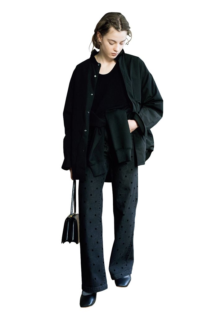 ドット柄のデニムに、ニットタンクとダウンシャツ、さらに腰にはスウェットをひと巻きしてボリュームアップ。素材が更新されたベーシックなアイテムたちを味方につけて、フレキシブルなかけ合わせを堪能。