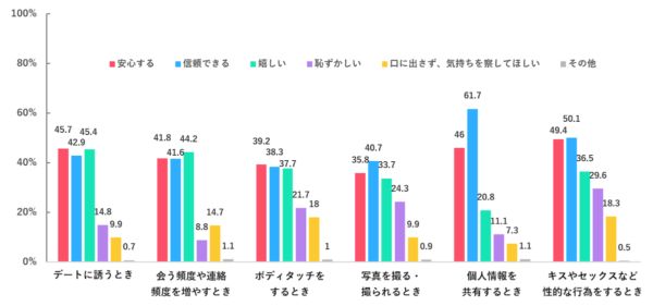 さらに、シチュエーション別に「同意を取られること」についての感情についてたずねた設問では、ほぼすべてのシチュエーションにおいて「安心する」「信頼できる」「嬉しい」が4割以上を占めています。